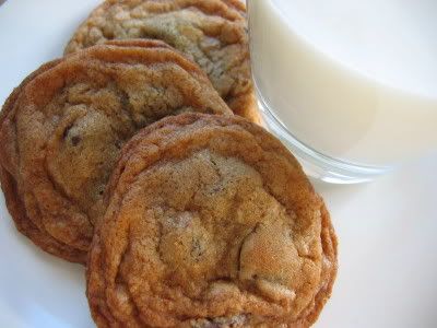 IMBB. I failed. Mine were some yummy cookies, but not my own personal cookie nirvana: they turned out thin and crispy instead of thick and chewy-inside-crunchy-outside, and a little greasy to boot. Not long after that, I complained in these pages about my weight gain, and swore off baking for a while. Suckers! Of course I can’t stop baking. It was just a question of finding the right excuse. Luckily, yesterday was my brother-in-law’s birthday, and everyone knows there’s no better gift than a batch of made-with-love chocolate chip cookies…