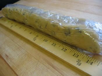 We don’t live near BIL, so I planned to make them in time to mail. Taking a suggestion from Angela at A Spoonful of Sugar, I tried refrigerating the dough first. She told me she shapes hers into hockey pucks, then chills them before baking. Frankly, I’m a little too lazy for that, so I thought I’d try going the Pillsbury route by making a homemade cookie schlong: